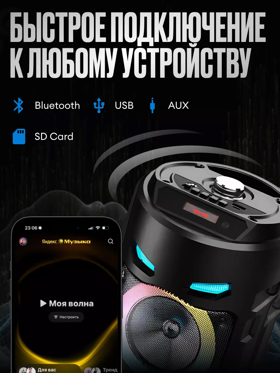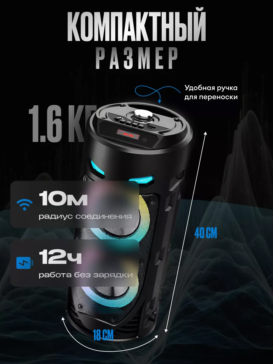 Особенностью данной модели является управляемая LED подсветка, которая добавляет атмосферу и делает ваши вечеринки ещё более яркими. Колонка поддерживает беспроводное подключение через Bluetooth с радиусом действия до 10 метров, что позволяет воспроизводить музыку с мобильных устройств без лишних проводов. Также предусмотрены дополнительные способы подключения через AUX, USB и microSD, что делает её универсальным устройством для воспроизведения музыки.